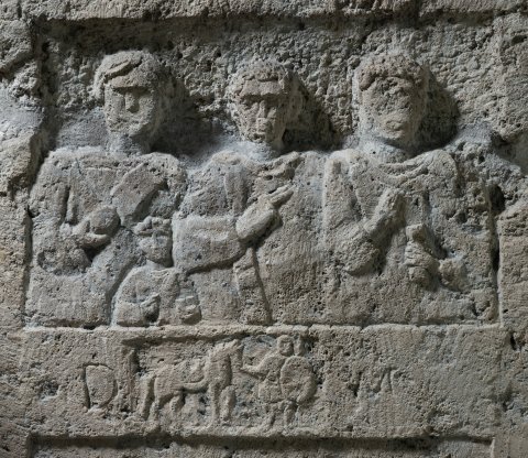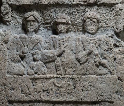 Im Hauptbild Familie: in Rechtecknische Brustbilder von drei Erwachsenen und einem Kind. Links Frau: Mittelscheitel, Ärmelgewand, Umhang, in der Linken Apfel. In der Mitte Mann: bartlos, Ärmeltunica, Mantel mit Borte (?). Rechts Mann: bartlos, Sagum, in der Linken Rolle (volumen). Vorn Kind (Mädchen?).