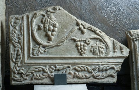 Verkleidungsplatte mit profiliert gerahmten Bildfeld, darin Weinranken, ganz rechts, in der ehemaligen Mittelachse des Bildes Beine einer kleinen männlichen Figur mit hohen Schuhen.