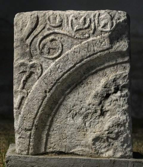 Stele mit horizontalem Abschluss, Bogennische mit profiliertzem RAhmen, im Eckzwickel Palmette und Ranken; im Bogenfeld Reliefreste (Kranz ? Goregoneion ?)