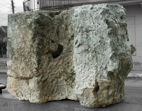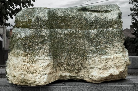 - stark verwittert, Oberfläche tlw. abgeschlagen, auf der Rückseite zylindrisch ausgehöhlt