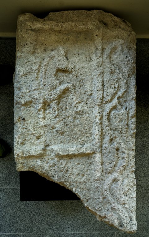 - Sockelbild einer Stele mit Reiter nach rechts, auf der Rahmenleiste Ranke; unterhalb des Relieffelds vermutlich Krater, aus dem Ranken wachsen ?