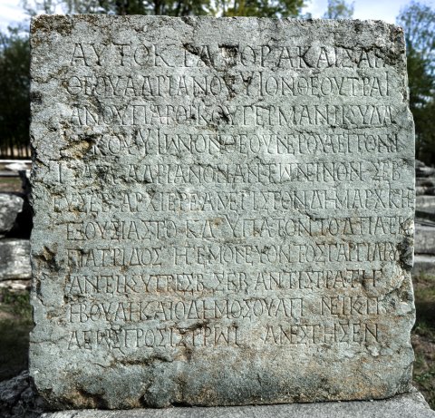Εὐσεβ(ῆ) ἀρχιερέα μέγιστον δημαρχικῆς / ἐξουσίας τὸ κδʹ ὕπατον τὸ δʹ πατέρα / πατρίδος ἡγεμονεύοντος Γαργιλίου / Ἀντείκου πρεσβ(ευτοῦ) Σεβ(αστοῦ) ἀντιστρατήγο[υ] / ἡ βουλὴ καὶ ὁ δῆμος Οὐλπ(ίας) Νεικοπό̣/λεως πρὸς Ἴστρωι ἀνέστησεν