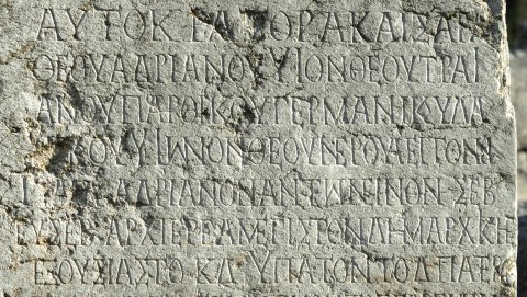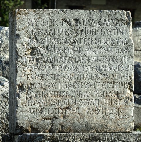 θεοῦ Ἁδριανοῦ υἱόν θεοῦ Τραι/ανοῦ Παρθικοῦ Γερμανικοῦ Δα/κικοῦ υἱωνόν θεοῦ Νέρουα ἔγγονον / Τ(ίτον) Αἴλ(ιον) Ἁδριανὸν Ἀντωνεῖνον Σεβ(αστὸν) /