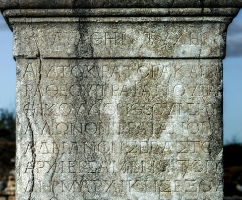Αὐτοκράτορα Καίσα/ρα θεοῦ Τραιανοῦ Παρ/θικοῦ υἱόν θεοῦ Νέρου/α υἱωνόν Τραιανὸν / Ἁδριανὸν Σεβαστὸν / ἀρχιερέα μέγιστον / δημαρχικῆς ἐξου/σίας τὸ κʹ αὐτο/κράτορα τὸ βʹ ὕπα/τον τὸ γʹ πατέρα / πατρίδος ἡ βουλὴ / καὶ ὁ δῆμος Οὐλπίας Νεικο/πόλεως τῆς πρὸς Ἴστρῳ