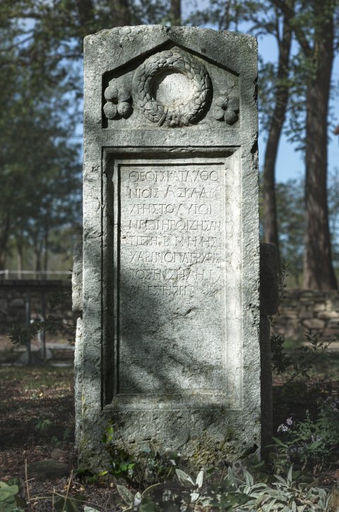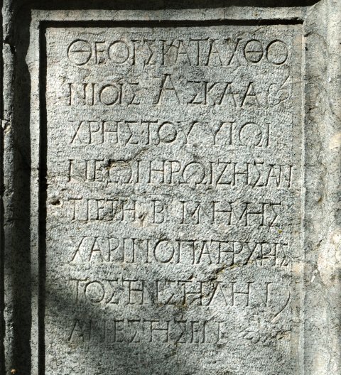 - Griechisch: Θεοῖς Καταχθονίοις. Ἀσκλᾷ / Χρήστου υἱῷ / νέωι ἥρωι ζήσαν/τι ἔτη βʹ μνήμης / χάριν ὁ πατὴρ Χρῆσ/τος τὴν στήλην / ἀνέστησεν