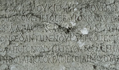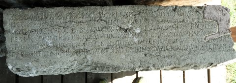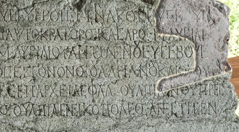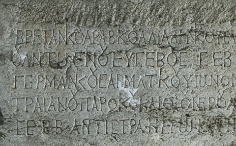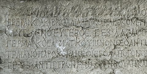 - griechisch: 〚[Λούκιον Σεπτίμιον Γέταν Καίσαρα]〛 Λουκίου Σεπτιμίου Σεουήρου Περτίνακος Εὐσεβοῦς / Βρετανικοῦ Ἀραβικοῦ Ἀδιαβηνικοῦ Παρθικοῦ μεγίστου Σεβ(αστοῦ) υἱὸν καὶ Αὐτοκράτορος Καίσαρος Μ(άρκου) Αὐρηλί/ου Ἀντωνείνου Εὐσεβοῦς Σεβ(αστοῦ) ἀδελφὸν καὶ θεοῦ Μ(άρκου) Αὐρηλίου Ἀντωνείνου Εὐσεβοῦς / Γερμανικοῦ Σαρματικοῦ υἱωνόν θεοῦ Ἀντωνείνου Εὐσεβοῦς ἔγγονον θεοῦ Ἁδριανοῦ καὶ θεοῦ / Τραιανοῦ Παρθικοῦ καὶ θεοῦ Νέρουα ἀπόγονον ὑπατεύοντος τῆς ἐπαρχείας Φλα(βίου) Οὐλπιανοῦ πρεσ(βευτοῦ) / Σε∙ββ(αστῶν) ἀντιστρα(τήγου) ἡ ἱερωτά̣τ̣η βουλὴ καὶ ὁ κράτιστος δῆμος Οὐλπίας Νεικοπόλεος ἀνέστησεν