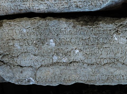 Αὐτοκράτορα Καίσαρα Λ(ουκίου) Σεπτιμίου Σεουήρου Π̣[ερτίνακος] Ε̣ὐσεβοῦς Σεβαστοῦ Ἀραβικοῦ Ἀδιαβηνικοῦ Παρθικοῦ / μεγίστου υἱόν θεοῦ Μάρκου Ἀντωνείνου Εὐσεβοῦς Γερμανικοῦ Σαρματικοῦ υἱωνόν θεοῦ Ἀντωνείνου Εὐσεβοῦς ἔγγο/νον θεοῦ Ἁδριανοῦ καὶ θεοῦ Τραιανοῦ Παρθικοῦ καὶ θεοῦ Νέρουα ἀπόγονον Μ(ᾶρκον) Αὐρήλιον Ἀντωνεῖνον Σεβαστὸν δημαρχι/κῆς ἐξουσίας ἀνθύπατον ὑπατεύοντος τῆς ἐπαρχείας Αὐρη(λίου) Γάλλου πρεσβ(ευτοῦ) Σεββ(αστῶν) ἀντιστρα(τήγου) ἡ ἱερωτά/τη βουλὴ καὶ ὁ κράτιστος δῆμος Οὐλπίας Νεικοπόλεως πρὸς Ἴστρον ἀνέστησεν
