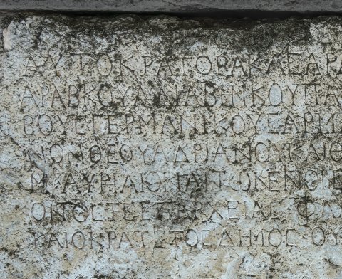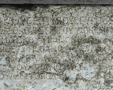 - griechisch: Αὐτοκράτορα Καίσαρα Λ(ουκίου) Σεπτιμίου Σεουήρου Περτίνακος Εὐσεβοῦς Σεβαστοῦ / Ἀραβικοῦ Ἀδιαβηνικοῦ Παρθικοῦ μεγίστου υἱόν θεοῦ Μάρκου Ἀντωνείνου Εὐσε/βοῦς Γερμανικοῦ Σαρματικοῦ υἱωνόν θεοῦ Ἀντωνείνου Εὐσεβοῦς ἔγγο/νον, θεοῦ Ἁδριανοῦ καὶ θεοῦ Τραιανοῦ Παρθικοῦ καὶ θεοῦ Νέρουα ἀπόγονον / Μ(ᾶρκον) Αὐρήλιον Ἀντωνεῖνον Σεβαστόν δημαρχικῆς ἐξουσίας ἀνθύπατον ὑπατεύ/οντος τῆς ἐπαρχείας Φλα(βίου) Οὐλπιανοῦ πρεσβ(ευτοῦ) Σεββ(αστῶν) ἀντιστ(ρατήγου) ἡ ἱερωτάτη βουλὴ / καὶ ὁ κράτιστος δῆμος Οὐλ(πίας) Νεικοπόλεως ἀνέστησεν