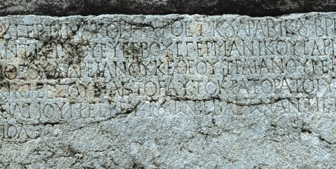 - griechisch: Λουκίου Σεπτιμίου Σευήρου Περ[τί]νακος Παρθεικοῦ Ἀραβικοῦ Βρεταννικοῦ Ἀδιαβηνικοῦ Εὐσε/βοῦς υἱόν θεοῦ Μάρκου Ἀντωνείνου Εὐσεβοῦς Γερμανικοῦ Σαρματικοῦ υἱωνόν θεοῦ Ἀντωνεί/νου Εὐσεβοῦς ἔγγονον θεοῦ Ἁδριανοῦ κὲ θεοῦ Τραιανοῦ Νέρου<α> <ἀπόγονον> Μ(ᾶρκον) Αὐρήλιον Ἀντωνεῖ/νον Σεβαστόν δημαρχικῆς ἐξουσίας τὸ ϛʹ, αὐτοκράτορα τὸ γʹ ὕπατον ὑπατεύοντος τῆς ἐπαρ/χείας Λ(ουκίου) Ἰουλίου Φαυστεινειανοῦ πρεσβευτοῦ τῶν Σεβαστῶν ἀντιστρατήγου, ἡ κρατίστη βουλὴ καὶ ὁ / δῆμος Οὐλπίας Νικοπόλεως