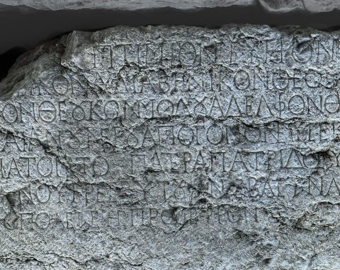 - griechisch: Αὐτ[οκράτορα Καίσαρα Λούκιον Σε]πτίμιον Σεουῆρον Περτίνακα Σεβ(αστὸν) εὐσε/βῆ Παρθικὸν̣ [μέγιστον Ἀραβ]ικὸν Ἀδιαβηνικόν θεοῦ Μ(άρκου) Ἀντωνείνου Εὐσεβοῦς / Γερμανικοῦ Σαρμα[τικοῦ] υἱόν θεοῦ Κομμόδου ἀδελφόν, θεοῦ Ἀντωνείνου υἱωνόν / θεοῦ Ἁδριανοῦ ἔγγονον θεοῦ Τραιανοῦ Νέρουα ἀπόγονον Εὐσεβῆ μέγιστον δημαρχικῆς <ἐξουσίας> / τὸ αὐτοκράτορα τὸ ὕπατον τὸ πατέρα πατρίδος, ὑπατεύοντος τῆς ἐπαρ/χείας Λ(ουκίου) Ἰουλίου Φαυστεινειανοῦ πρεσβευτοῦ [τῶ]ν Σεβαστῶν ἀντιστρατήγου ἡ ἱερωτάτη βου/λὴ καὶ ὁ δῆμος Οὐλπείας Νεικοπόλεως τῆς πρὸς Ἴστρον