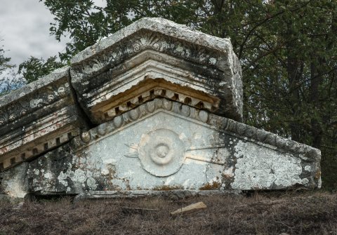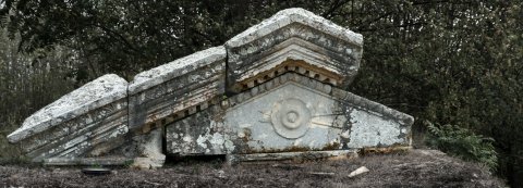 - Im Giebelfeld Rundschild und zwei Speere, am oberen Rand Eierstab. Gesims mit Palmettenfries und Zahnschnitt. Der Giebel gehörte zu einem der vier Tore des sogen. Thermoperipathos.