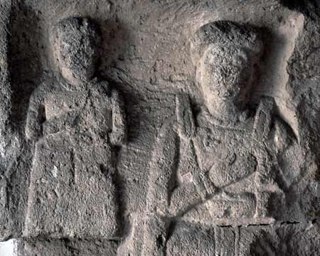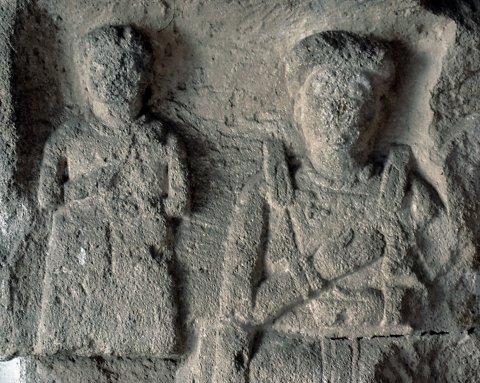 - Ganzfiguren. Rechts sitzende einheimische Frau: Haube, Obergewand, Flügelfibeln, Gürtel, Halskette, breite Armreifen. Links erhöht stehendes Mädchen: gegürtetes Kleid, Halsband.