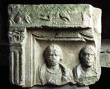 Auf der linken Nebenseite in Bogennische stehender nackter Knabe (Genius), linker Ellbogen auf Pfeiler (?) gelehnt, in der rechten Hand Kranz (?). Über dem Bogen Hase.