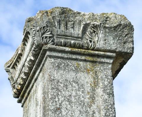 - Eckige Pfeiler mit glattem Schaft und abgetrepptem Sockel; vierseitiges Kapitell mit Pfeifenstab an drei Seiten und Eckpalmetten.