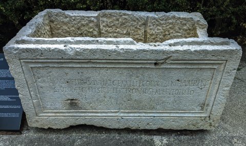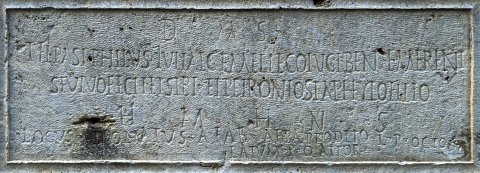 - D(is) M(anibus) s(acrum) / T(itus) (A)el(ius) Pasiphilus A(?) Iuliae Gemell(a)e co(n)iugi bene merenti / se vivo et sibi et Petronio Staphylo filio / h(oc) m(onumentum) h(eredem) n(on) s(equetur) / locus donatus a FAB aera proditio l(ongum) p(edes) octo / latum p(edes) quatt(u)or