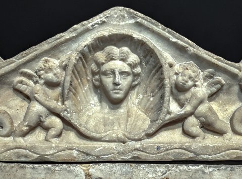 Dachförmiger Deckel, im Giebelfeld von Eroten getragenen Muschelnische, darin bekleidete Büste einer Frau mit Melonenfrisur, darunter Wellenlinie, seitlich Palmettenakrotere.