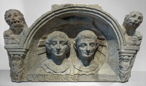 - Bogennische mit Muschel, darin unbekleidete Büsten einer Frau und eines bartlosen Mannes (Ehepaar); der profilierte Bogen wird seitlich von Atlanten getragen, über diesen liegende Löwen mit Tierkopf unter den Vorderpranken.