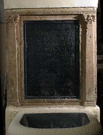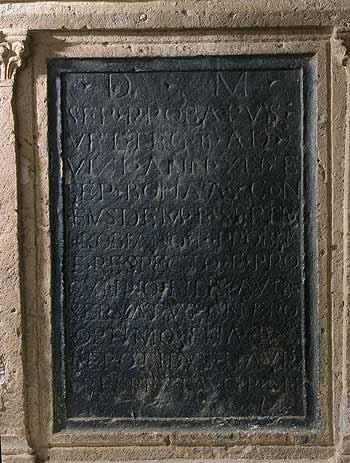- D(is) M(anibus) / Sep(timius) Probatus / vet(eranus) leg(ionis) II ad(iutricis) / vixit ann(os) XLV et / Sep(timiae) Boniatae con(iugi) / eiusdem et Septimio / Probiano et Probil(l)ae / et Respecto et Pro/culino fili(i)s Aur(elius) / Servatus genero / optimo filiae et / nepotibus et Aur(eliae) / Respectae c(oniugi) p(ientissimae) m(emoriam) p(osuit)