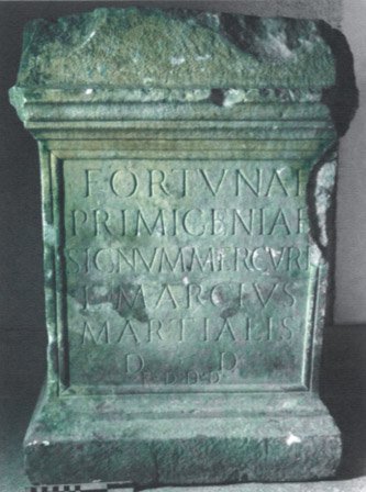 - Fortunae / Primigeniae / signum Mercuri / L(ucius) Marcius / Martialis / d(onum) d(edit) / l(ocus) d(atus) d(ecreto) d(ecurionum)
