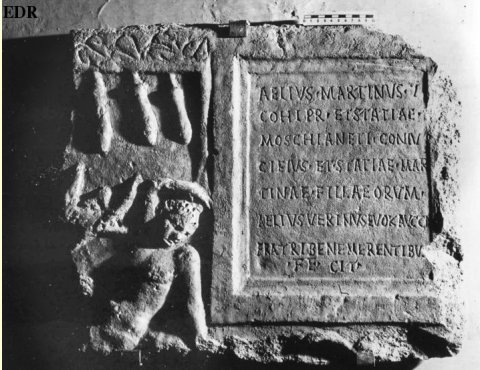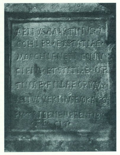 - Aelius Martinus |(centurio) / coh(ortis) pr(aetoriae) et Statiae / Moschianeti coniu/ci(!) eius et Statiae Mar/tinae fillae(!)(e)orum / Aelius Verinus evok(atus) Aucc(ustorum)! n(ostrorum) / fratri bene merentibus / fecit