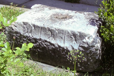 - Abschlussplatte eines Grabaltars mit Eckakroteren, dazwischen Blattdekor : stehende Weinblätter. Oben Dübelloch für Bekrönung.