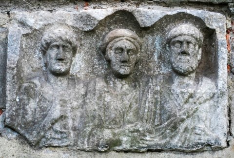 - In Nische mit drei Bögen drei Halbfiguren (Familie). Von links: Mann: bärtig, Ärmeltunica, Gegenstand in rechter Hand. Einheimische Frau: Haube, Umhang. Mann: Ärmeltunica, Sagum, in der linken Hand Volumen. Der Mann rechts reicht der Frau die Hand.