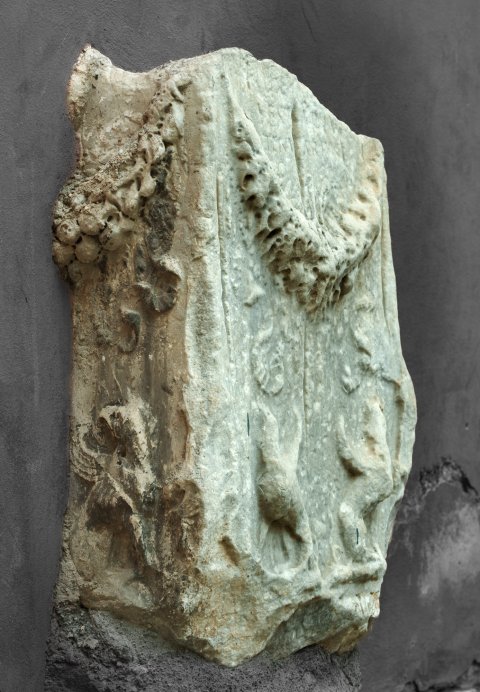 - oben u. unten abgebr., Nebenseiten zur Hälfte eingemauert, Oberfläche stark verwittert
