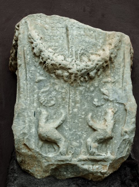 - Auf der Vorderseite oben Inschrift, darunter Blattgirlande mit Tänien und zwei hockende Greifen. Auf den Nebenseiten Fruchtgirlanden, darüber Gefäß, darunter Greifen. An den Ecken mit Kandelaber