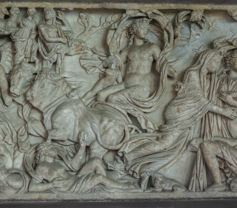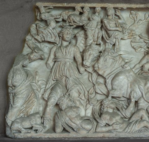 - Mythos: in der Mitte Selene (Luna), nackt bis auf hinter dem Kopf sich blähenden Mantel, auf einem von Rindern gezogenen Wagen, rechts schlafender Endymion mit der bekleideten Selene; zu seinen Häupten jugendlicher Hypnos mit Horn in der Rechten. Unten Flussgötter, oben Lokalgottheiten, Schafe und Hirten.