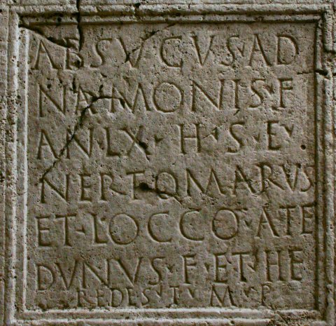 - Absucus Ad/namonis f(ilius) / an(norum) LX h(ic) s(itus) e(st) / Nertomarus / et Locco Ate/dunus f(ilii) et he/redes t(itulum) m(emoriae) p(osuerunt)