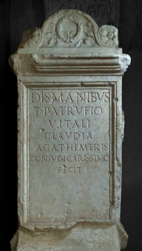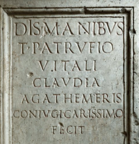 - Dis Manibus / T(ito) Patrufio / Vitali / Claudia / Agathemeris / coniugi carissimo / fecit // Dis Manibus / T(ito) Patrufio / Vitali / Claudia / Agatemeris / coniugi carissimo / fecit
