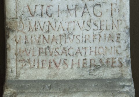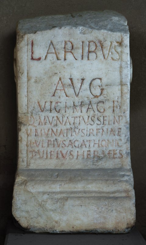 - Laribus / Aug(ustis) / vici mag(istri) f(ecerunt) / Q(uintus) Munatius Selinp(us?) / M(arcus) Munatius Irenae(us) / M(arcus) Ulpius Agathonic(us) / T(itus) Vibius Hermes
