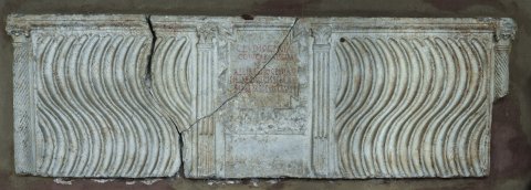 - Riefelsarkophag, an den beiden Ecken Säulen mit Spiralkannelur, in der Mitte gerahmtes Schriftfeld zwischen kannelierten Pilastern.