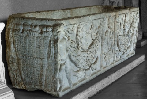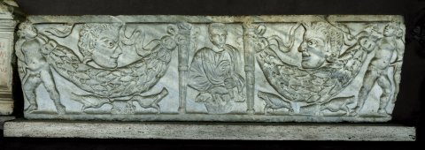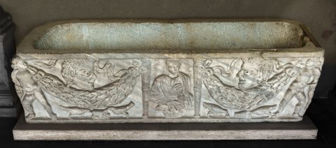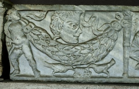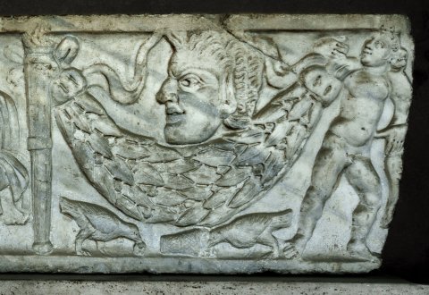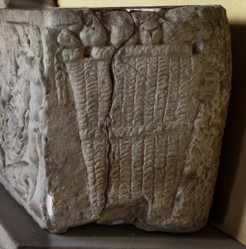 Auf der Vorderseite in der Mitte über einerm Blätterkelch Halbfigur eines Jünglings in Toga, in der Linken Rolle (volumen). Seitlich Fackeln, an denen Girlanden befestigt sind, deren anderes Ende von nackten Knaben (Erot, Genius) getragen wird. Über den Girlandenbögen Satyrkopf im Profil, unter den Bögen Fruchtkorb zwischen Vögeln.