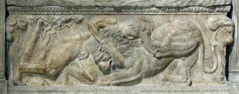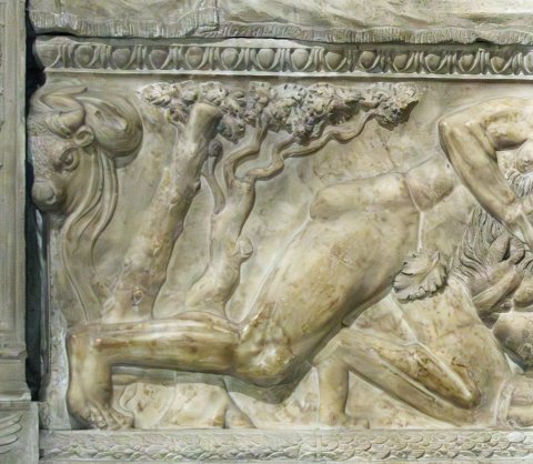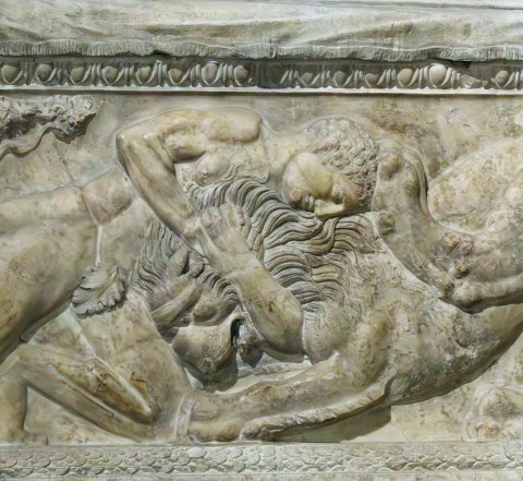 - Mythos: Herakles (Hercules) ringt mit dem nemeischen Löwen, links die an einen Baum gelehnte Keule; an den Ecken Rinderkopf mit Tänien, am oberen Rand Eierstab, am unteren Lorbeerstab.