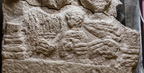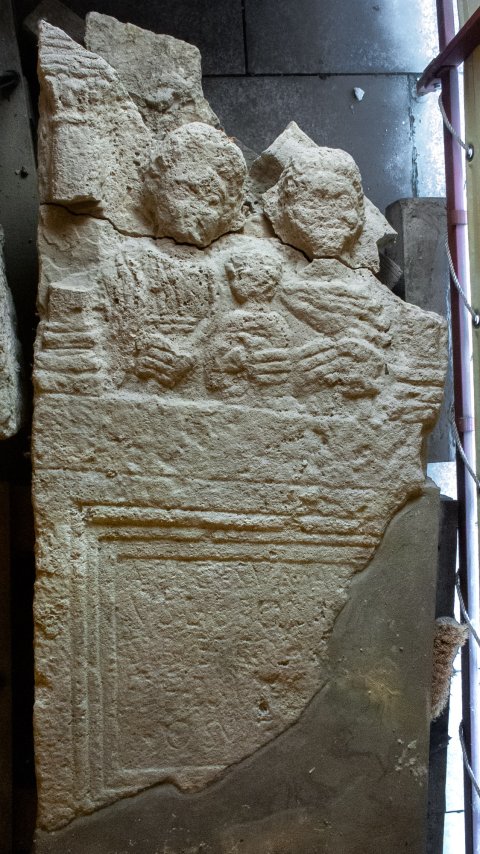 - Eingeschriebener Giebel mit Gorgoneion, auf den Schrägen stehende Löwen, Seitenakrotere. Im Hauptbild zwischen Säulen Brustbilder einer Familie (Ehepaar mit Kind). Links Frau: Tunica, Gürtel, Mantel. Rechts Mann: kurz gesträhntes Haar, Sagum, in der Linken Rolle (volumen). Vorn Kind, in den Händen Vogel.