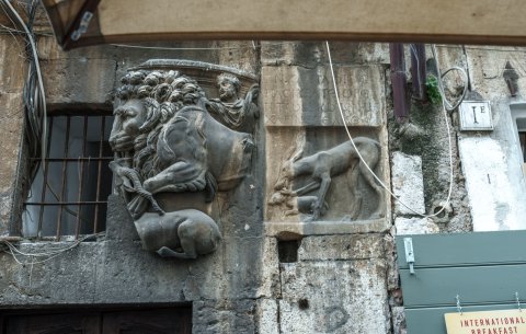 - unter dem rahmenlosen Schriftfeld Relief mit Hund und Hase
