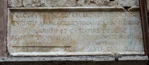 - P(ublius) Clodius A(uli) et Clodiae l(ibertus) Bromius eborarius / Curiatia Ammia concubina mei amantissima / Hilario P(ubli) et Curiatiae deliciae / P(ublius) Clodius P(ubli) et Curiatiae l(ibertus) / Rufio / P(ublius) Clodius P(ubli) et Curiatiae l(ibertus) / Anteros / P(ubli) Clodi P(ubli) l(iberti) Heraclidae / Suavis Curiatiae l(iberti)