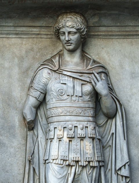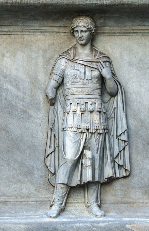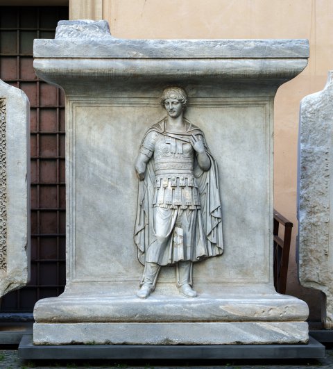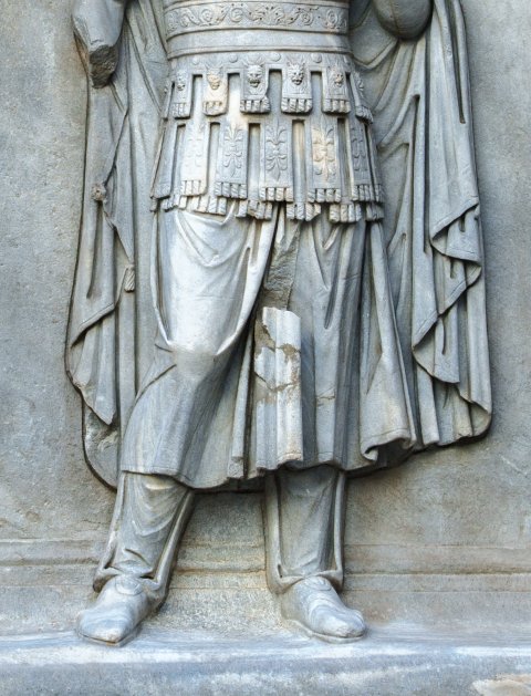 Platte mit profiliertem Rahmen, unten vorspringende Leiste, auf der die Figur steht. Personifikation einer Provinz in Brustpanzer, halblangem Gewand, Mantel und Hosen.
