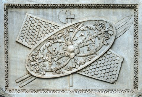 Rechteckige Platte mit Waffen: Ovalschild mit Rankenornament, darunter Rechteckschild mit Schuppen, zwei Lanzen, eine Streitaxt. Um das Bildfeld Profilrahmen mit Kymation.