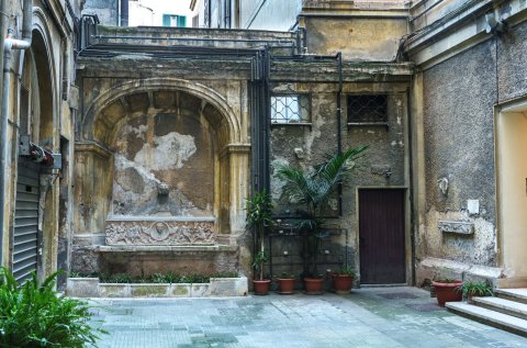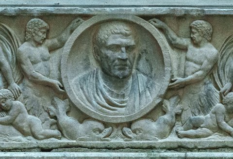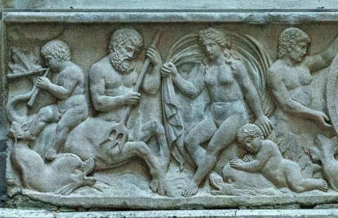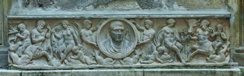 Im Zentrum rundes Medaillon mit bekleideter Büste eines bartlosen Mannes, seitlich gehalten von jugendlichen Tritonen, auf denen Nereiden reiten, die rechte mit Kithara in der Hand. Weiter außen Seekentauren, auf denen nackte musizierende Knaben reiten (links mit Doppelflöte, rechts mit Syrinx). Der linke Seekentaur mit Dreizck, der rechte bläst in eine Muschelschale und führt einen Stier am Strick. Unten Wellen mit Delphinen und zwei nackten flügellosen Knaben.