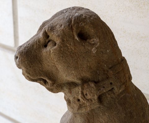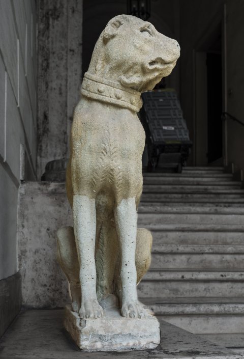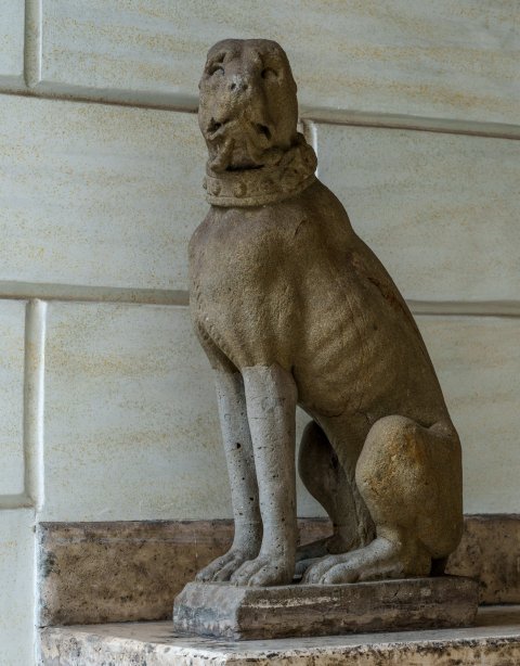 - zwei sitzende Hunde mit Halsband mit Beschlägen
