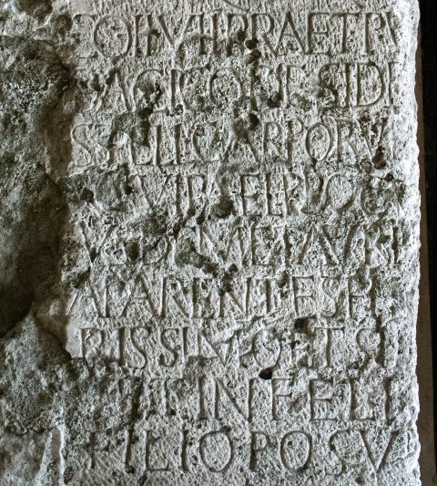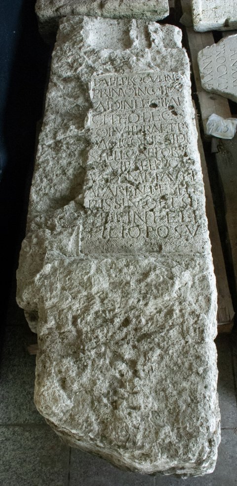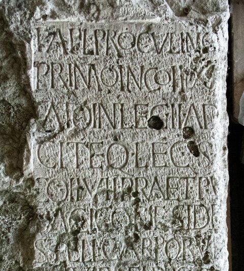 - P(ublio) Ael(io) Proculino [e(gregiae) m(emoriae) v(iro) -- |(centurioni)] / primo in coh(orte) |(miliaria) [Hemes(enorum) trans]/lato in leg(ionem) II ad[iut(ricem) p(iam) f(idelem) exer]/cit(atori) eq(uitum) leg(ionis) s(upra) [s(criptae) |(centurioni) coh(ortis) --- urb(anae) |(centurioni)] / coh(ortis) VII praet(oriae) p(iae) v(indicis) [Phil(ippianae) bello] / Dacico deside[rato ad ca]/stell(um) Carporum [milit(avit) ann(os)] / XXVI P(ublius) Ael(ius) Procu[lus |(centurio) coh(ortis) ei]/usdem et Aure[lia ---]/a parentes fil[io suo ca]/rissimo et sib[i vivis] / et infelic[issimo] / filio posue[runt]