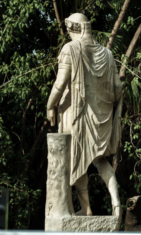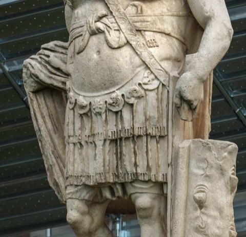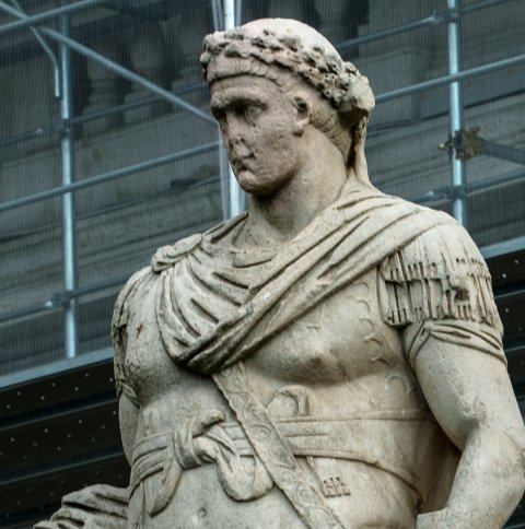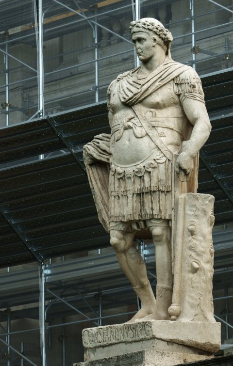 - Historische Person: Kaiser Constantinus I. im Brustpanzer mit Lorbeerkranz, neben dem linken Bein Baumstammstütze; auf der Plinthe (Kalkstein) Inschrift.