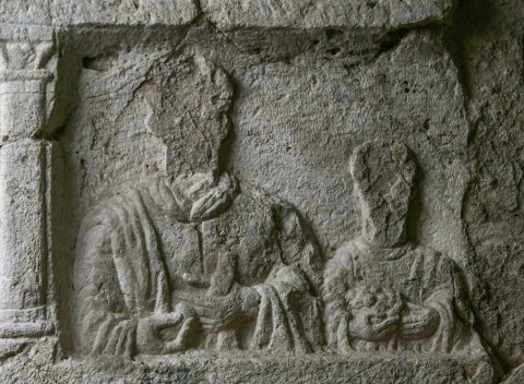 - Giebelspitze u. rechter Rand verbr., Relief tlw. abgeschlagen