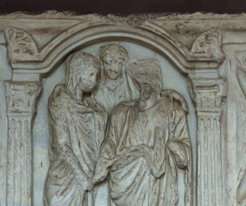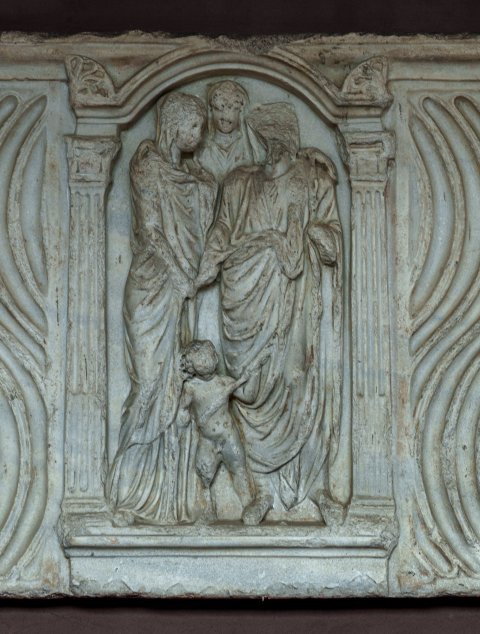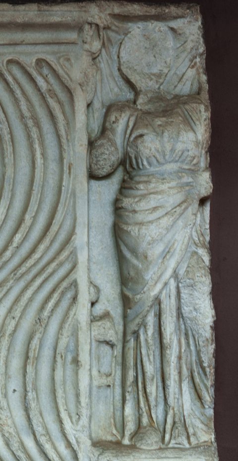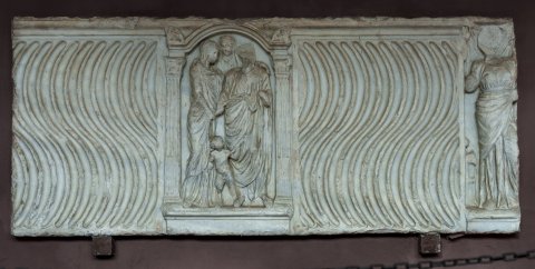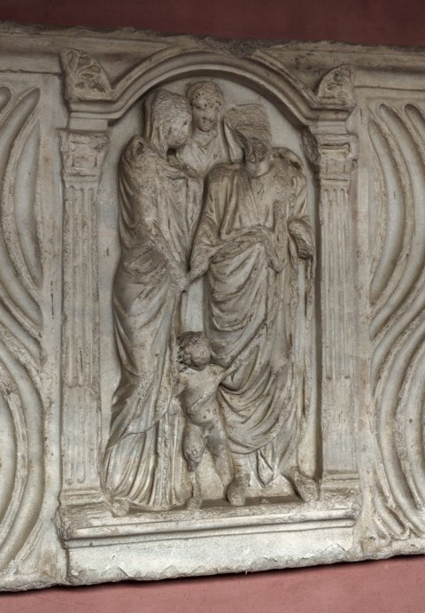 Riefelsarkophag, in der Mitte Aedicula mit Bogen auf kannelierten Pilastern. In der Nische Hochzeitsszene mit Ehepaar, die Frau in Mantel und Schleier, der Mann in Toga; im Hintergrund zwischen ihnen verschleierte Frau (Concordia), unten vor ihnen Erot mit erhobener Fackel,