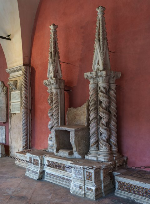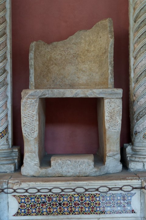 - Rückenlehne oben u. seitlich abgebr., Vorderkanten von Sitzfläche u. Bodenfläche abgebr., Löwenbeine der Wände unter der Sitzfläche oben abgemeißelt, unten abgebr.
