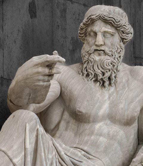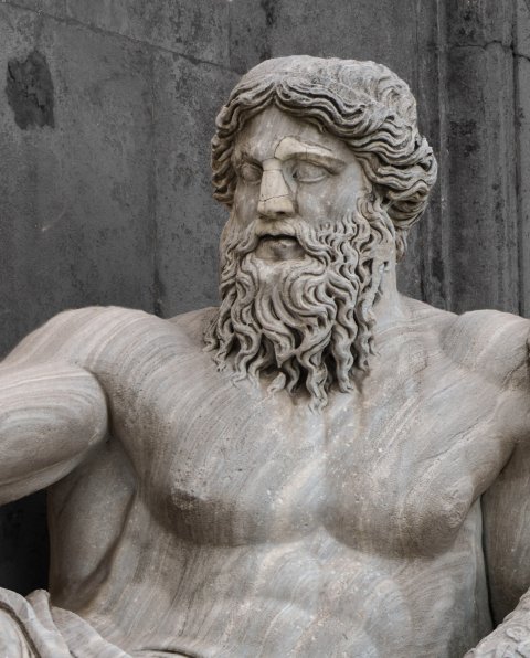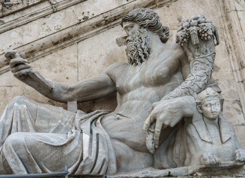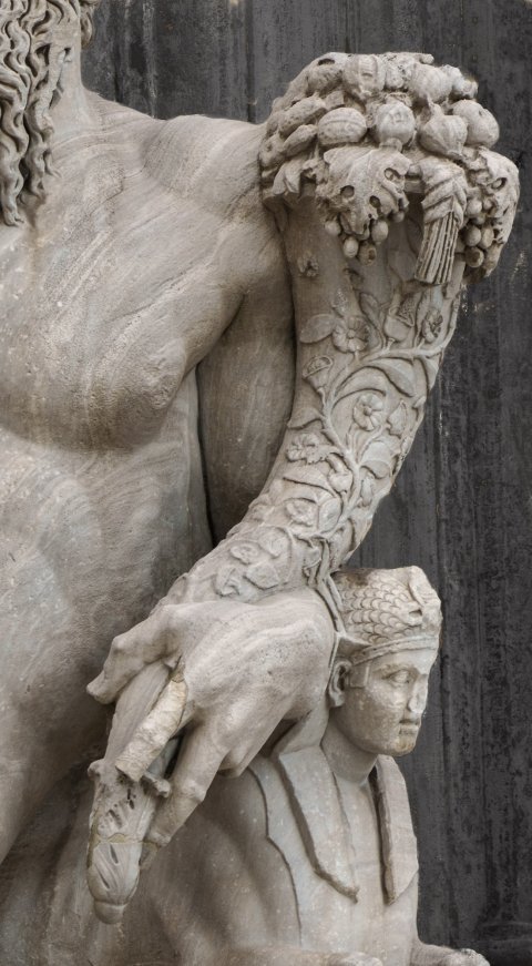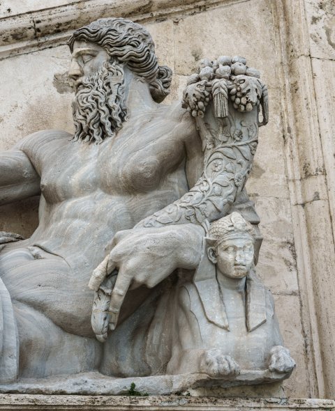 - Mythische Figur: Personifikation des Nil; gelagerter Flussgott mit langem, aufgestecktem Haar, lockigem Vollbart, Mantel um Hüften und Beine, in der rechten Hand Rest eines Ährenbüschels; im linken, auf eine Sphinx mit ägyptischem Kopftuch gestützten Arm Füllhorn.