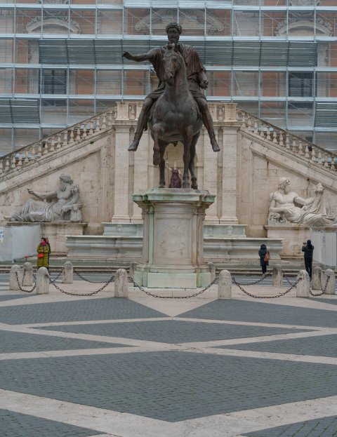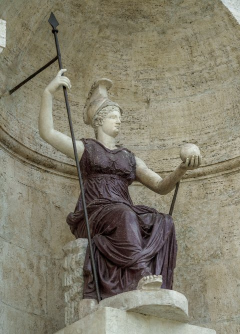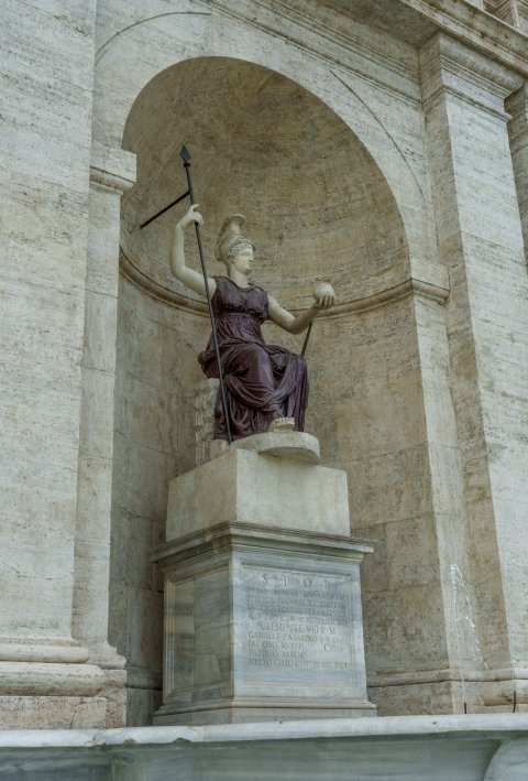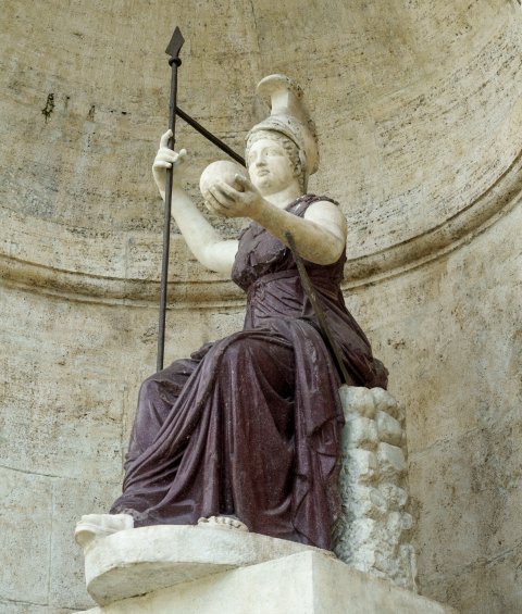 - Mythische Figur: thronende Dea Roma (ursprünglich Minerva mit Aegis) mit Helm, in der erhobenen Rechten Lanze, in der Linken Globus. Gewand Porphyr, Kopf Marmor.