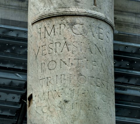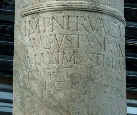 - I / Imp(erator) Caesar / Vespasianus Aug(ustus) / pontif(ex) maxim(us) / trib(unicia) potestat(e) VII / Imp(erator) XVII p(ater) p(atriae) censor / co(n)s(ul) VII design(atus) VIII // Imp(erator) Nerva Caesar / Augustus pontifex / maximus tribunicia / potestate co(n)s(ul) III pat(er) / patriae refecit